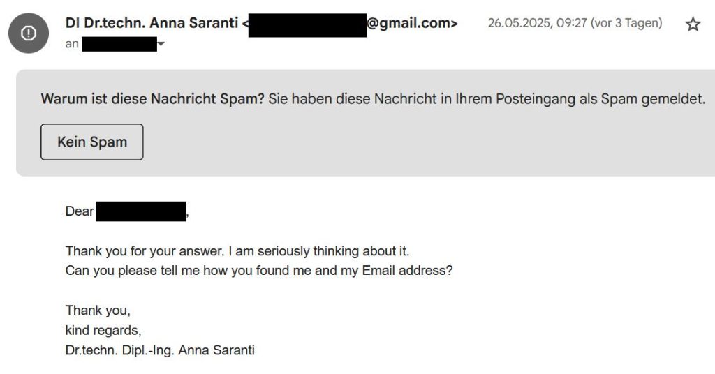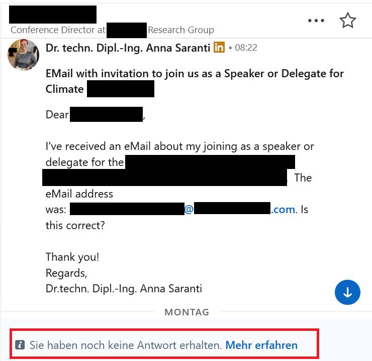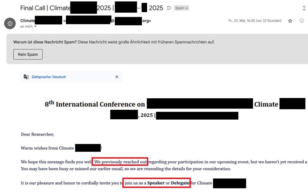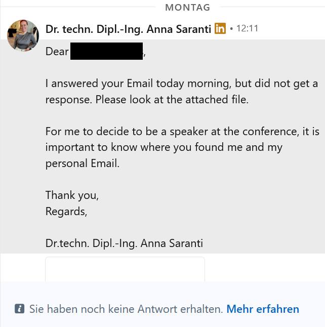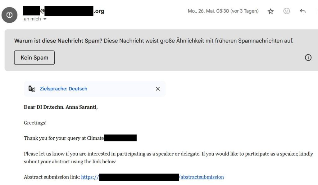 The organisers of the “Climate” conference did not respect my professional statement and answer. First of all they also don’t answer concretely about where they’ve found my private EMail; look how similar this answer is to the previous case; ” was obtained through publicly available professional platforms or academic profiles—such as university websites, research publications, or conference proceedings—where speakers and researchers often list their contact details for professional networking purposes.”
