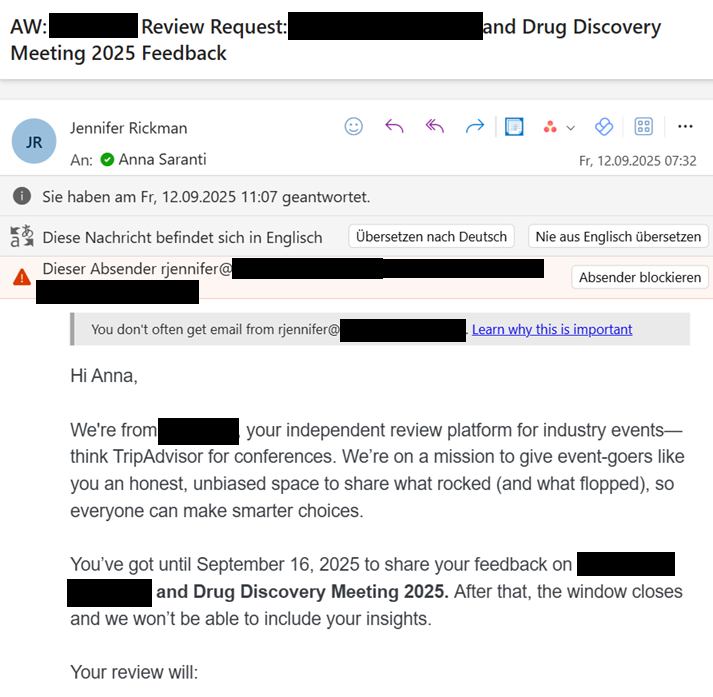 On Friday, 12.09.2025, after I’ve posted the answer to the unrequested and unnecessary reference letter, the following EMail came into a very private EMail address that is not in ANY conference, presentation or website. It was correctly recognised as “Spam”, but I wanted to have all the info and keep it for obvious reasons.