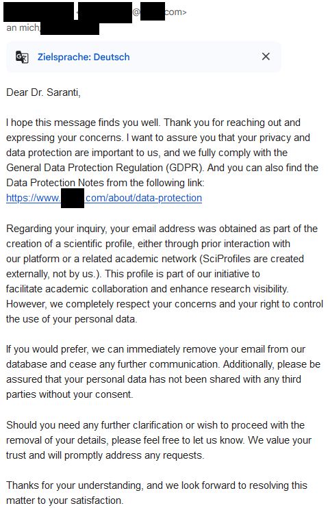 I’ve received the answer on 20.09.2024 that my private Email address “was obtained as part of the creation of a scientific profile, either through prior interaction with our platform or a related academic network (SciProfiles are created externally, not by us.)”