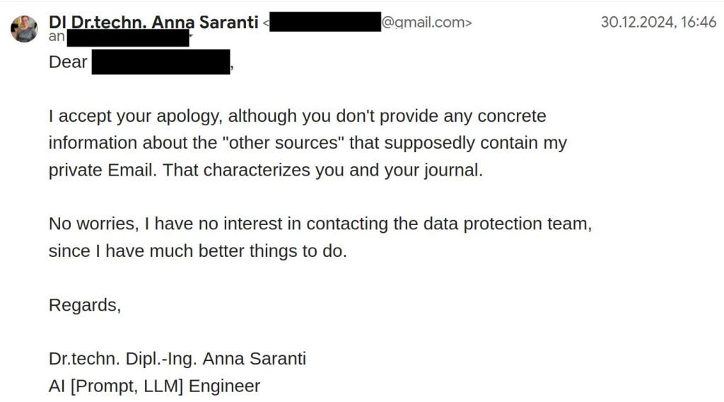 Towards the end of 2024, I was still receiving offers for publication. I could not believe that journals wanted to collaborate with me without checking first my Google Scholar or LinkedIn profile. In one of those cases I saw that my personal EMail was in some proceedings – maybe by Typo, but I had to take full responsibility. Nonetheless, I could still refer to my official statement and say that I did not want to publish any more. I laughed at those cases that referred to “my research group” thinking about what happened in 2024.