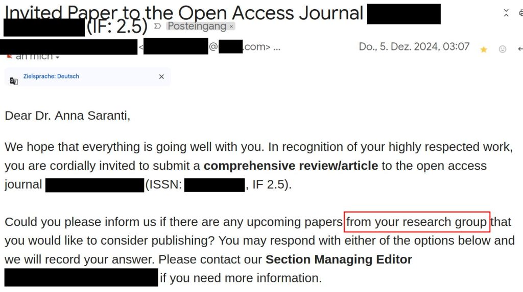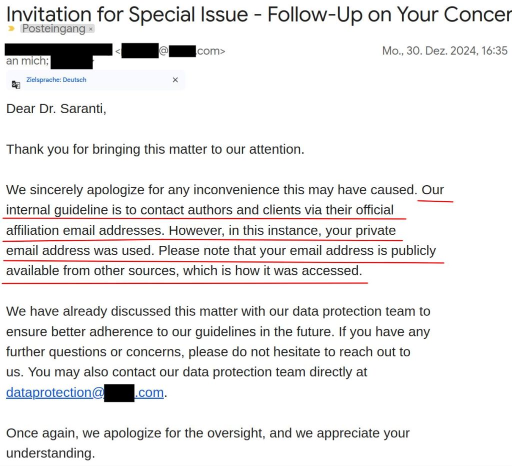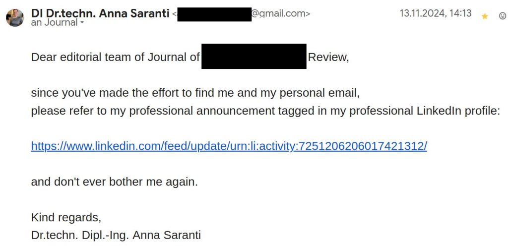 One of those offers came from the journal that did not answer since 26.09.2024. Nonetheless, they replied towards the end of December with an apology that I truly appreciate, but at the time I was not so patient to handle gracefully. I’ve unsubscribed from wherever I could. I had to come to terms with the fact that not every journal knows what I went through, that I was getting messages at inappropriate times, that my private phone number was illegally shared, that I was registered without my consent and I had to deal with so many unprofessional behaviors like professional ghosting. That’s when I started to think about publishing all this anonymously; for many people, all those experiences were clearly unimaginable.